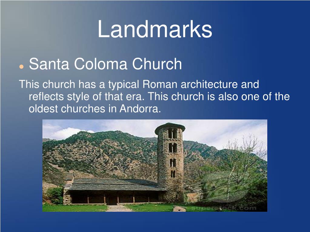 Landmarks Santa Coloma Church This church has a typical Roman architecture and reflects style of that era. This church is also one of the oldest churches in Andorra.