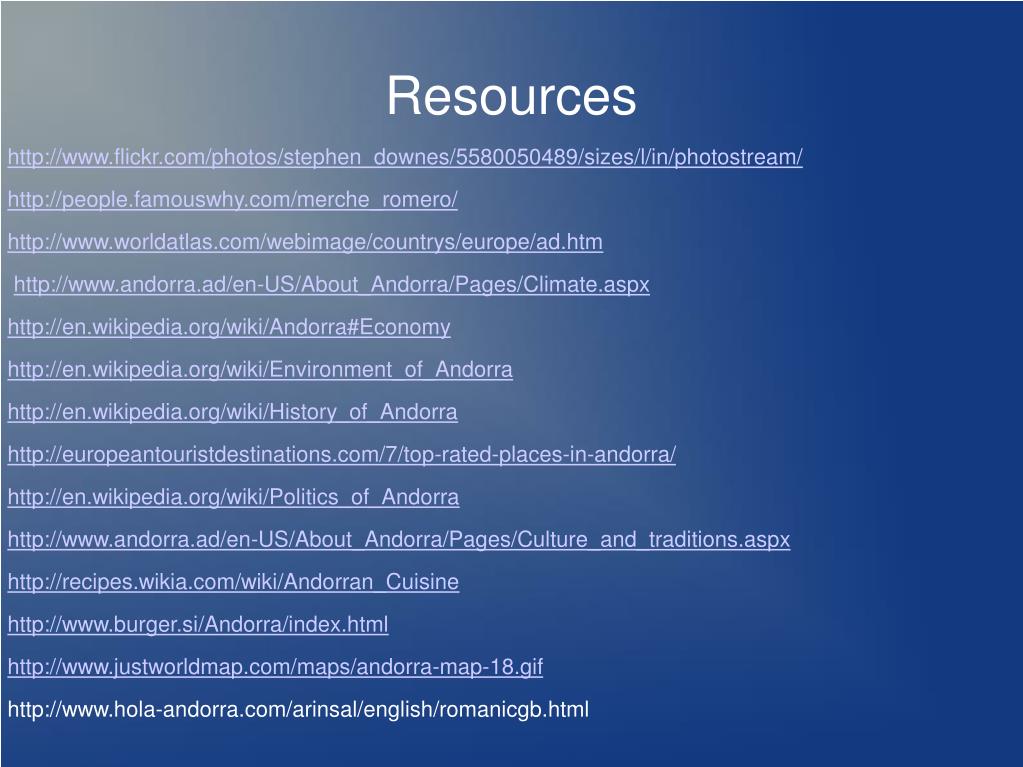Resources http://www.flickr.com/photos/stephen_downes/5580050489/sizes/l/in/photostream/ http://people.famouswhy.com/merche_romero/ http://www.worldatlas.com/webimage/countrys/europe/ad.htm http://www.andorra.ad/en-US/About_Andorra/Pages/Climate.aspx http://en.wikipedia.org/wiki/Andorra#Economy http://en.wikipedia.org/wiki/Environment_of_Andorra http://en.wikipedia.org/wiki/History_of_Andorra http://europeantouristdestinations.com/7/top-rated-places-in-andorra/ http://en.wikipedia.org/wiki/Politics_of_Andorra http://www.andorra.ad/en-US/About_Andorra/Pages/Culture_and_traditions.aspx http://recipes.wikia.com/wiki/Andorran_Cuisine http://www.burger.si/Andorra/index.html http://www.justworldmap.com/maps/andorra-map-18.gif http://www.hola-andorra.com/arinsal/english/romanicgb.html