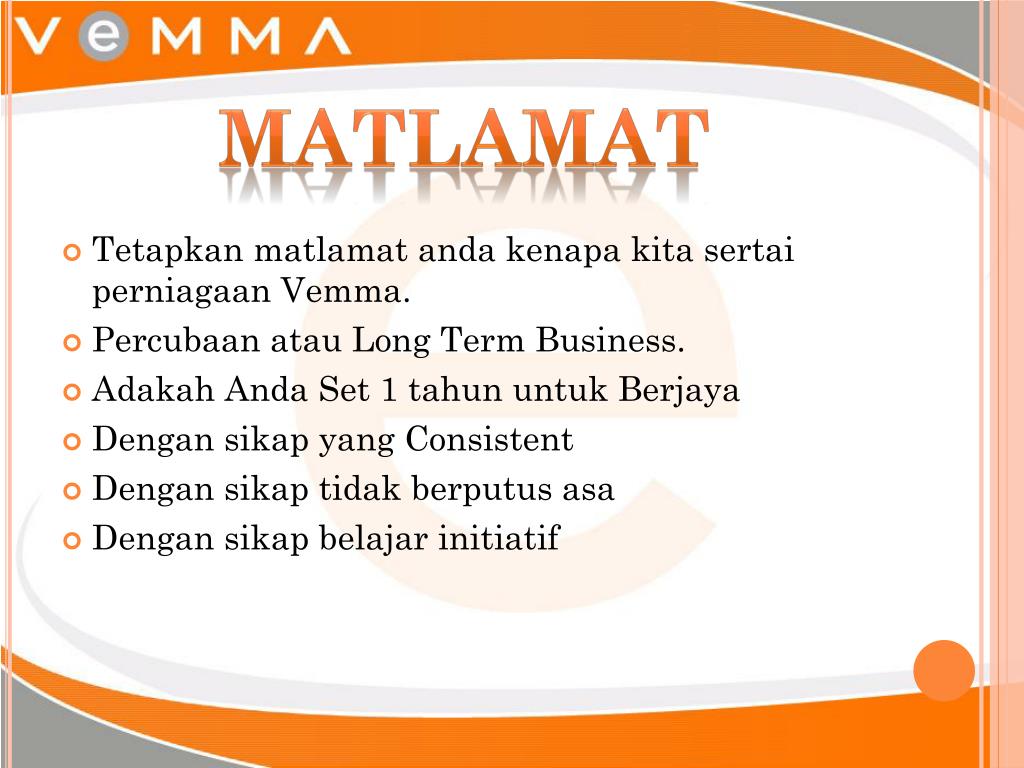 MATLAMAT • TetapkanmatlamatandakenapakitasertaiperniagaanVemma. • Percubaanatau Long Term Business. • AdakahAnda Set 1 tahununtuk Berjaya • Dengansikap yang Consistent • Dengansikaptidakberputusasa • Dengansikapbelajarinitiatif