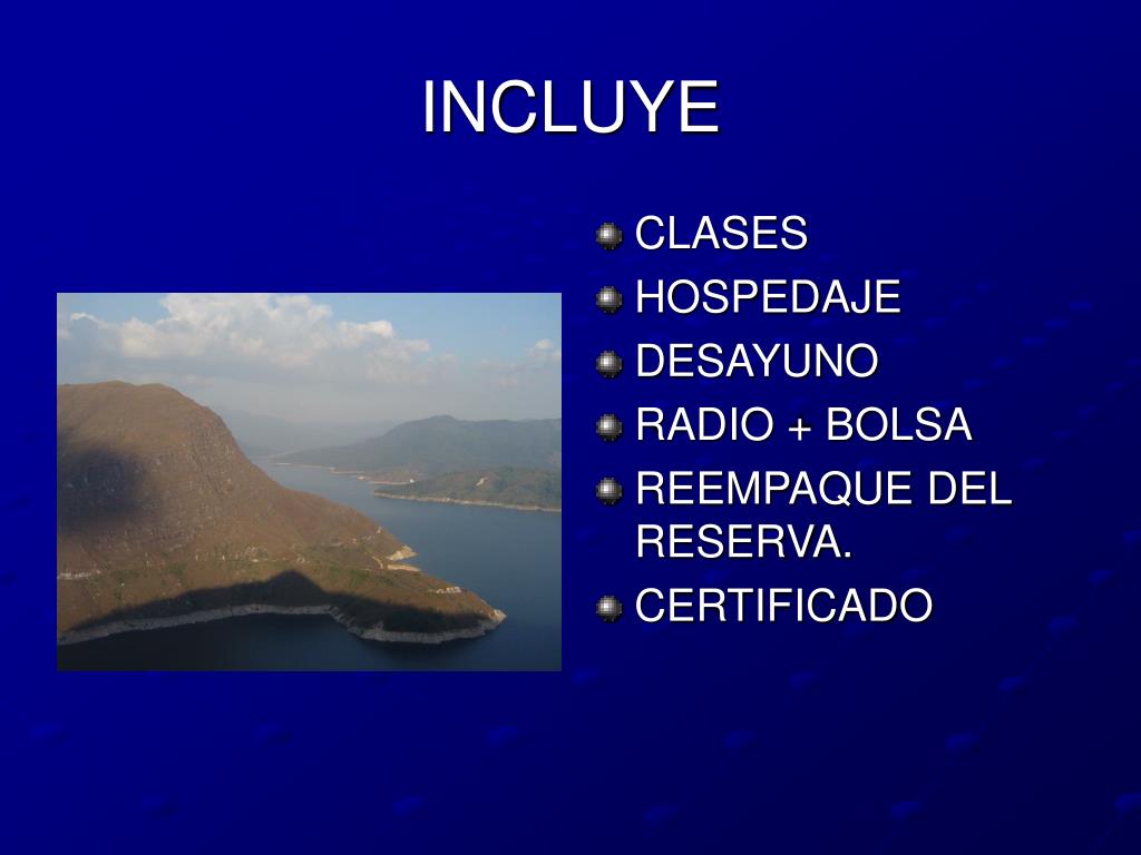 INCLUYE • CLASES • HOSPEDAJE • DESAYUNO • RADIO + BOLSA • REEMPAQUE DEL RESERVA. • CERTIFICADO