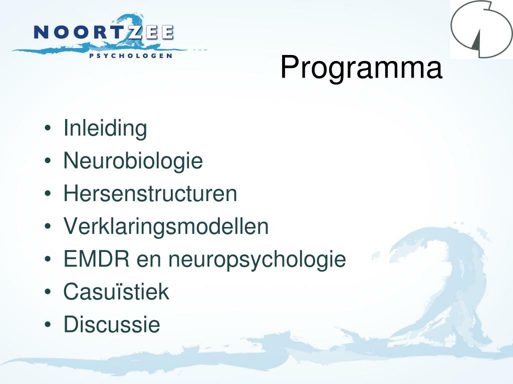 Programma • Inleiding • Neurobiologie • Hersenstructuren • Verklaringsmodellen • EMDR en neuropsychologie • Casuïstiek • Discussie