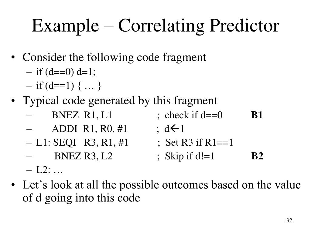 Example – Correlating Predictor • Consider the following code fragment • if (d==0) d=1; • if (d==1) { … } • Typical code generated by this fragment • BNEZ R1, L1 ; check if d==0 B1 • ADDI R1, R0, #1 ; d1 • L1: SEQI R3, R1, #1 ; Set R3 if R1==1 • BNEZ R3, L2 ; Skip if d!=1 B2 • L2: … • Let’s look at all the possible outcomes based on the value of d going into this code