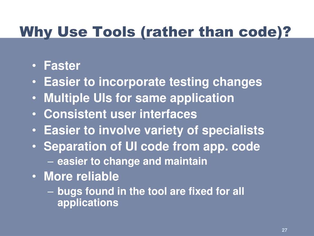 Why Use Tools (rather than code)? • Faster • Easier to incorporate testing changes • Multiple UIs for same application • Consistent user interfaces • Easier to involve variety of specialists • Separation of UI code from app. code • easier to change and maintain • More reliable • bugs found in the tool are fixed for all applications