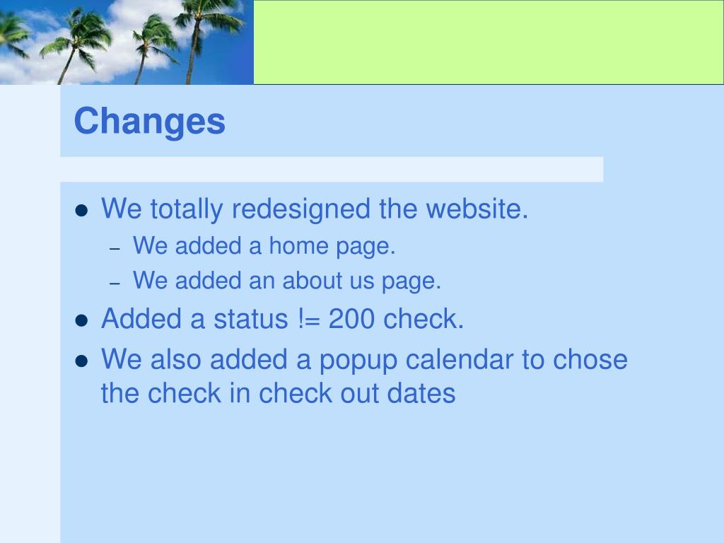 Changes • We totally redesigned the website. • We added a home page. • We added an about us page. • Added a status != 200 check. • We also added a popup calendar to chose the check in check out dates