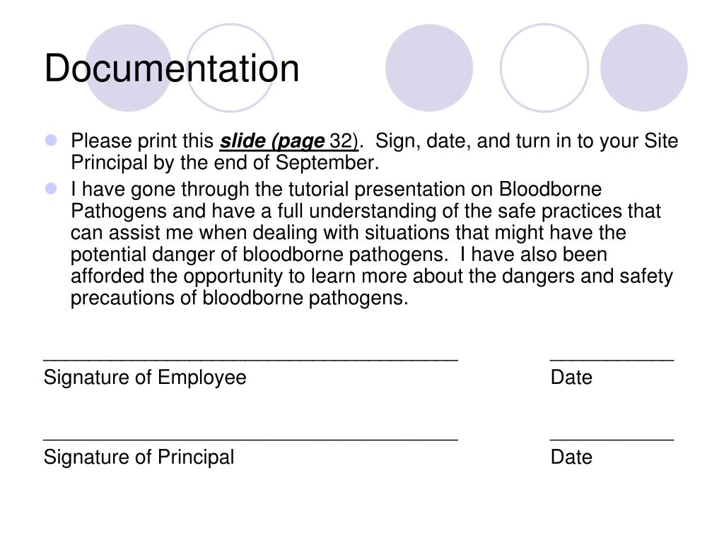 Documentation • Please print this slide (page 32). Sign, date, and turn in to your Site Principal by the end of September. • I have gone through the tutorial presentation on Bloodborne Pathogens and have a full understanding of the safe practices that can assist me when dealing with situations that might have the potential danger of bloodborne pathogens. I have also been afforded the opportunity to learn more about the dangers and safety precautions of bloodborne pathogens. _____________________________________ ___________ Signature of Employee Date _____________________________________ ___________ Signature of Principal Date
