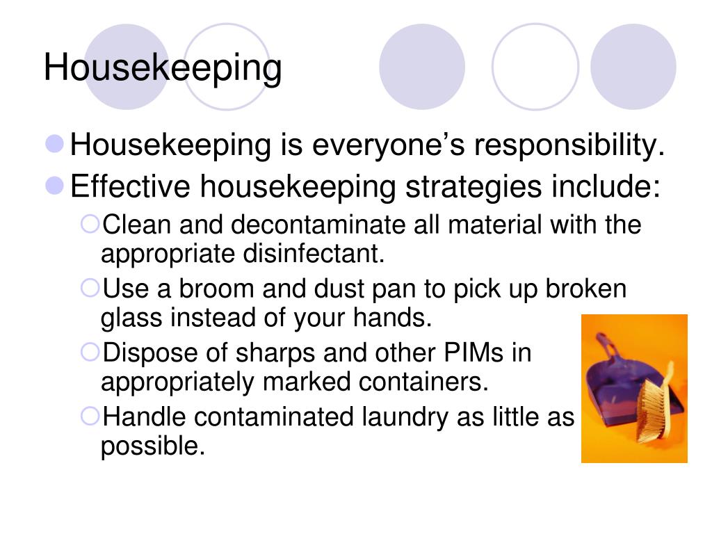 Housekeeping • Housekeeping is everyone’s responsibility. • Effective housekeeping strategies include: • Clean and decontaminate all material with the appropriate disinfectant. • Use a broom and dust pan to pick up broken glass instead of your hands. • Dispose of sharps and other PIMs in appropriately marked containers. • Handle contaminated laundry as little as possible.