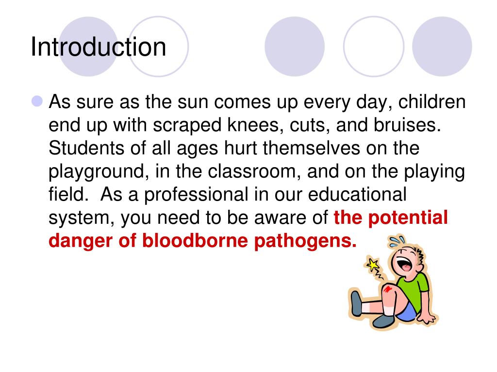 Introduction • As sure as the sun comes up every day, children end up with scraped knees, cuts, and bruises. Students of all ages hurt themselves on the playground, in the classroom, and on the playing field. As a professional in our educational system, you need to be aware of thepotential danger of bloodborne pathogens.
