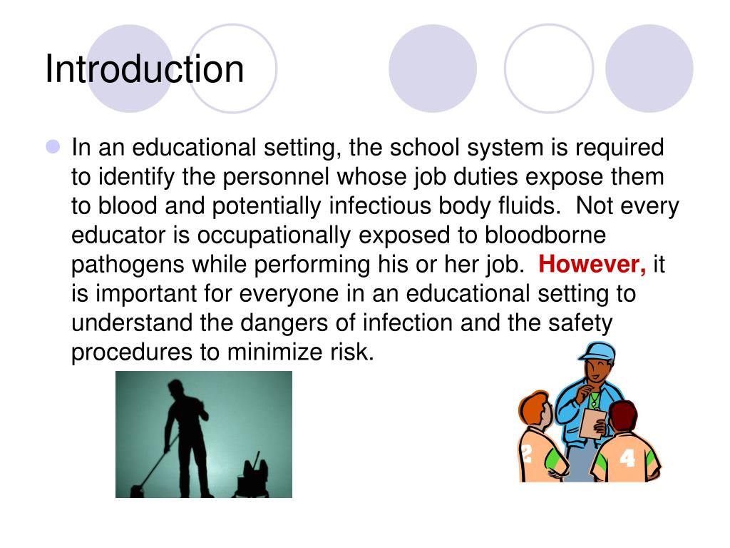Introduction • In an educational setting, the school system is required to identify the personnel whose job duties expose them to blood and potentially infectious body fluids. Not every educator is occupationally exposed to bloodborne pathogens while performing his or her job. However, it is important for everyone in an educational setting to understand the dangers of infection and the safety procedures to minimize risk.