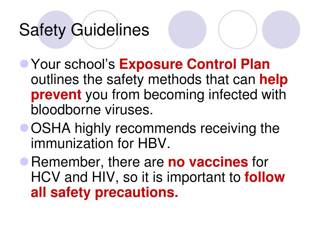 Safety Guidelines • Your school’s Exposure Control Plan outlines the safety methods that can helpprevent you from becoming infected with bloodborne viruses. • OSHA highly recommends receiving the immunization for HBV. • Remember, there are no vaccines for HCV and HIV, so it is important to follow all safety precautions.