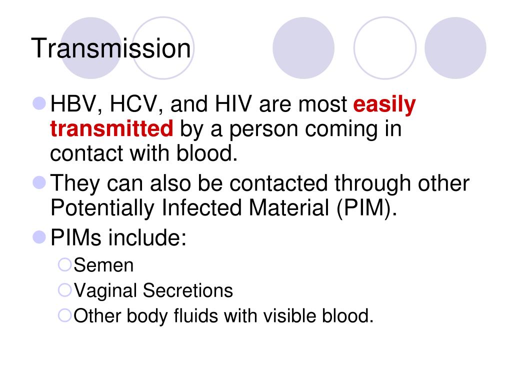 Transmission • HBV, HCV, and HIV are most easily transmitted by a person coming in contact with blood. • They can also be contacted through other Potentially Infected Material (PIM). • PIMs include: • Semen • Vaginal Secretions • Other body fluids with visible blood.