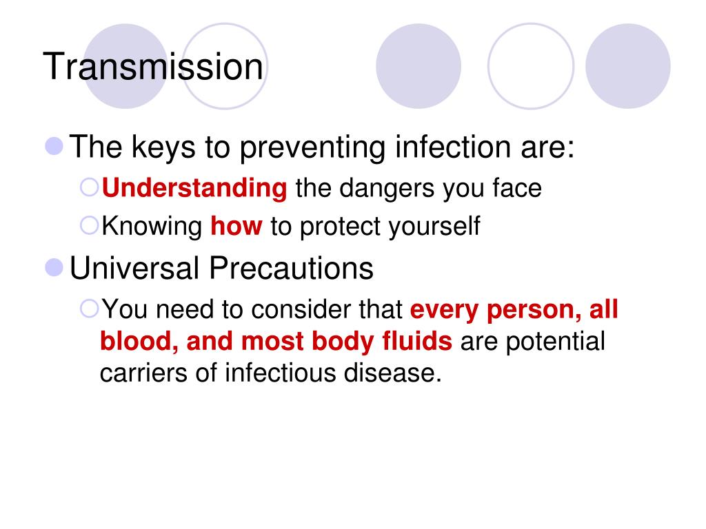 Transmission • The keys to preventing infection are: • Understanding the dangers you face • Knowing howto protect yourself • Universal Precautions • You need to consider that every person, all blood, and most body fluids are potential carriers of infectious disease.