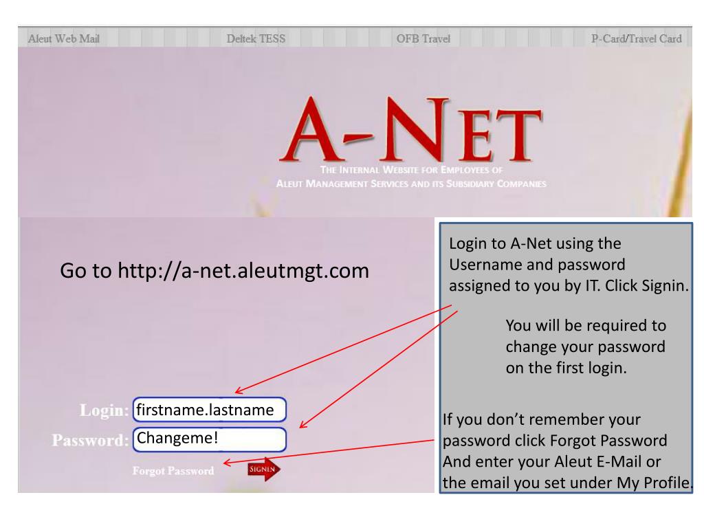 Login to A-Net using the Username and password assigned to you by IT. Click Signin. Go to http://a-net.aleutmgt.com You will be required to change your password on the first login. firstname.lastname If you don’t remember your password click Forgot Password And enter your Aleut E-Mail or the email you set under My Profile. Changeme!