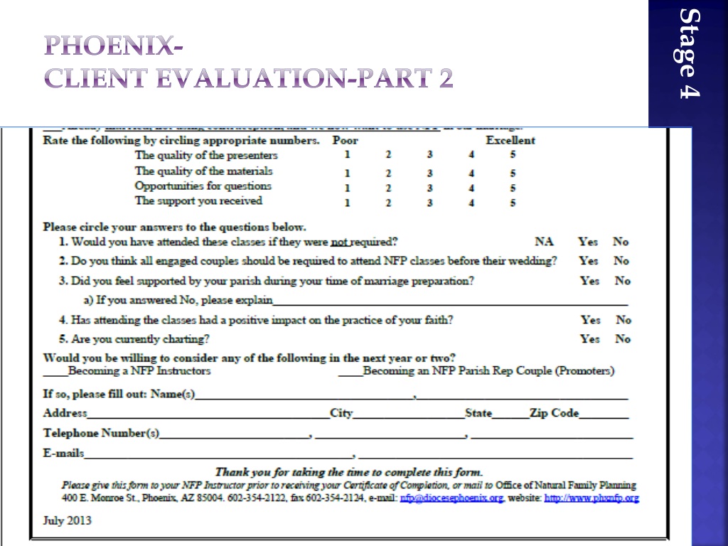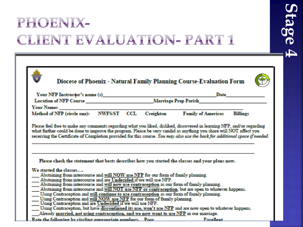 Diocese of PhoenixClient Statistics 2009: Pre- Policy-1234 Couples in Intros & 380 Couples Complete NFP Series 2010: Transition Year-520 Couples in Intros & 653 Complete NFP Series ( 1917 weddings) 2011: 1102 Couples complete NFP Series/1571 weddings ( 70% Compliance) 2012: 1062 Couples complete NFP Series/ no wedding stats yet 2013: 600 Couples complete 1st 6 months ( project 1200) Stage 4