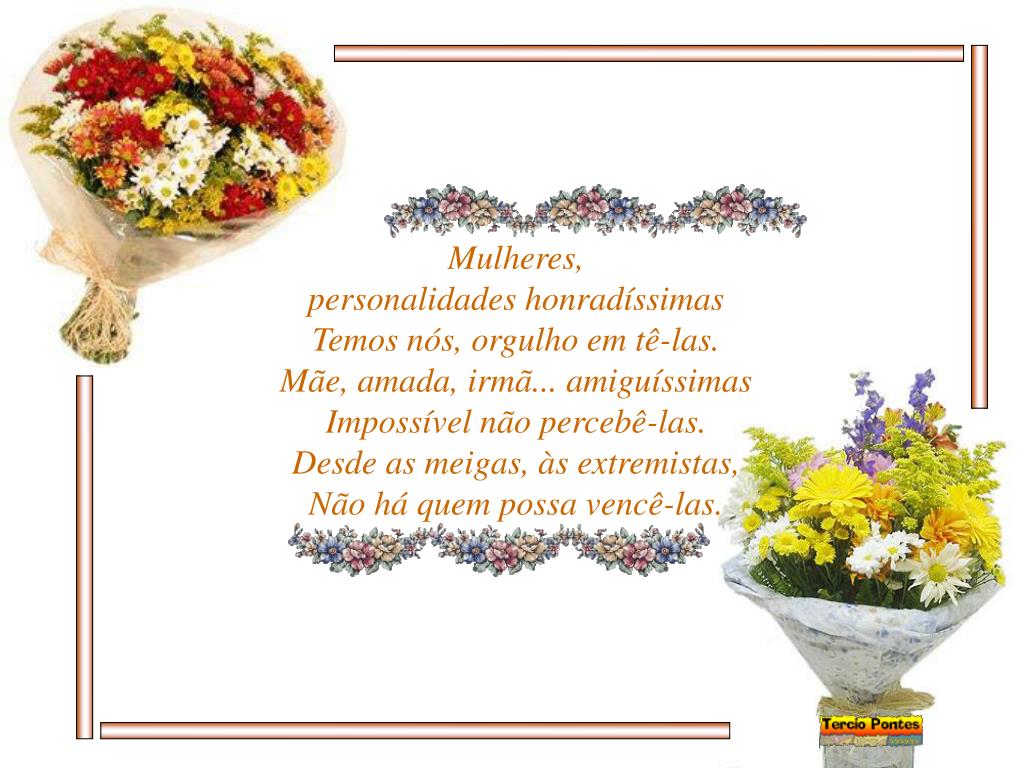 Mulheres, personalidades honradíssimas Temos nós, orgulho em tê-las. Mãe, amada, irmã... amiguíssimas Impossível não percebê-las. Desde as meigas, às extremistas, Não há quem possa vencê-las.