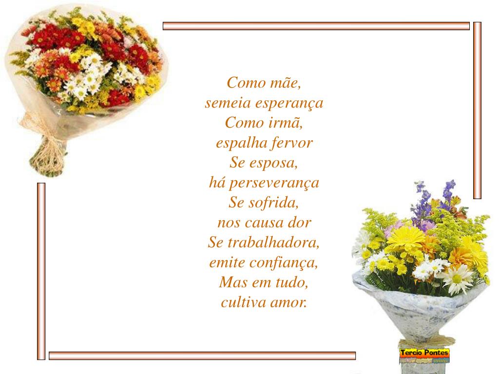 Como mãe, semeia esperança Como irmã, espalha fervor Se esposa, há perseverança Se sofrida, nos causa dor Se trabalhadora, emite confiança, Mas em tudo, cultiva amor.