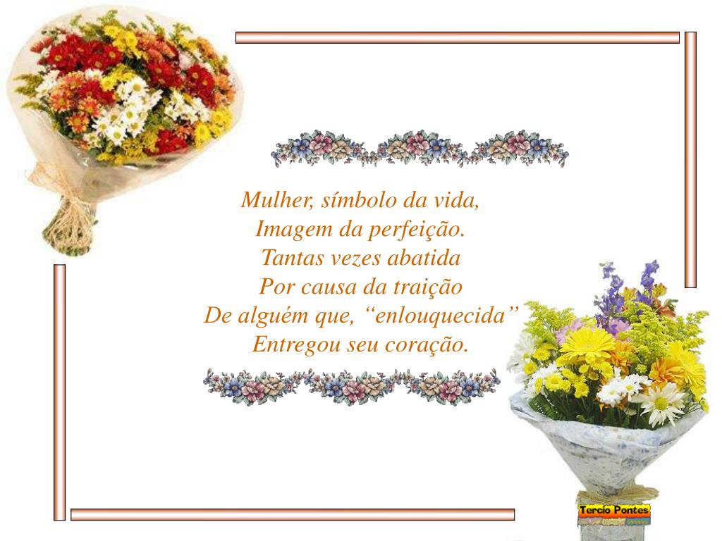 Mulher, símbolo da vida, Imagem da perfeição. Tantas vezes abatida Por causa da traição De alguém que, “enlouquecida” Entregou seu coração.