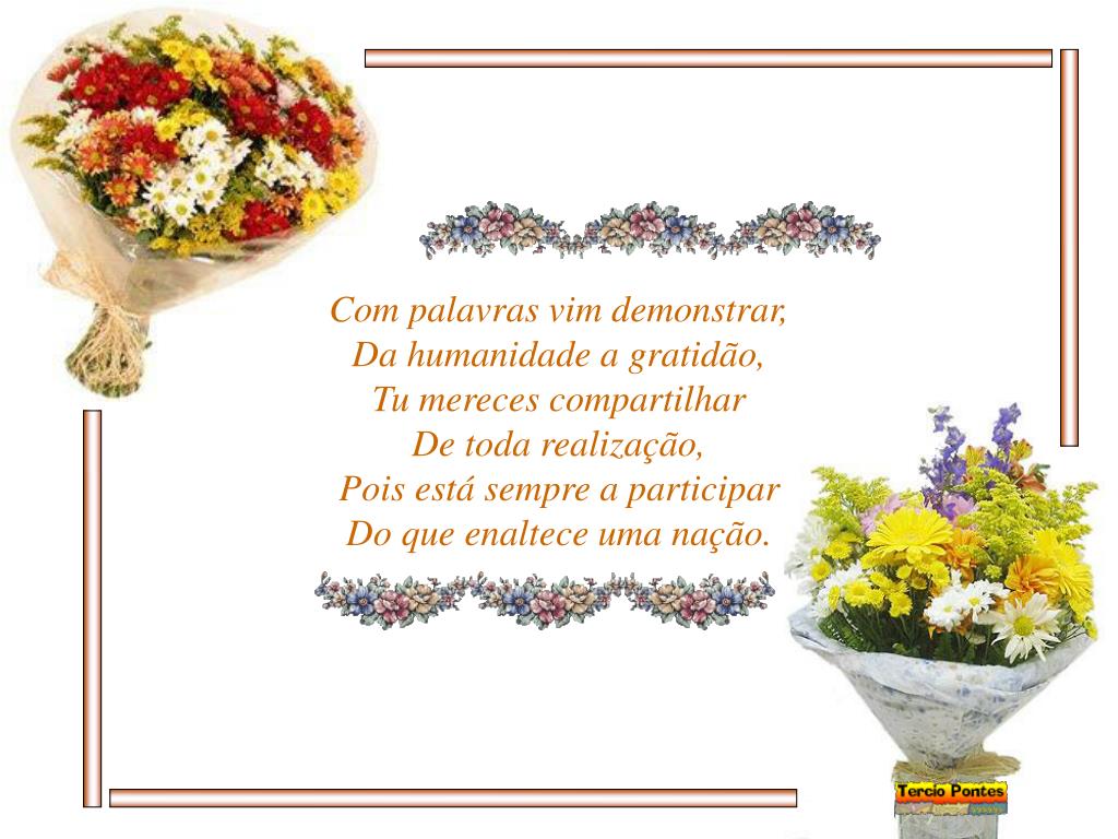 Com palavras vim demonstrar, Da humanidade a gratidão, Tu mereces compartilhar De toda realização, Pois está sempre a participar Do que enaltece uma nação.