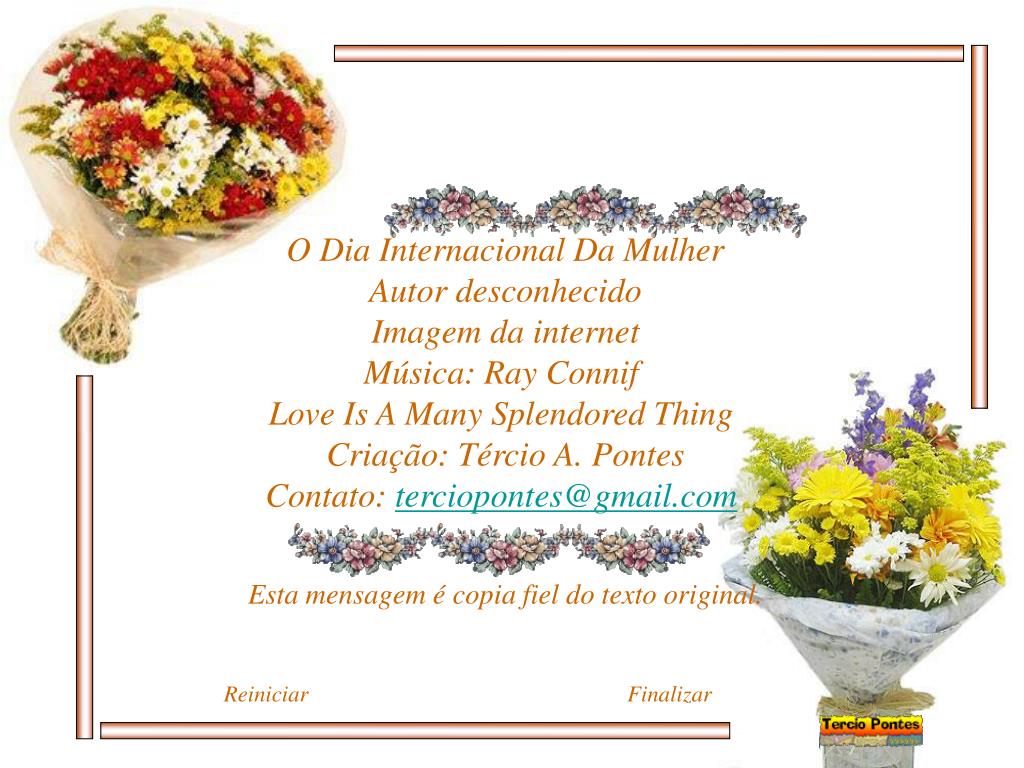O Dia Internacional Da Mulher Autor desconhecido Imagem da internet Música: Ray Connif Love Is A Many Splendored Thing Criação: Tércio A. Pontes Contato: terciopontes@gmail.com Esta mensagem é copia fiel do texto original. Reiniciar Finalizar