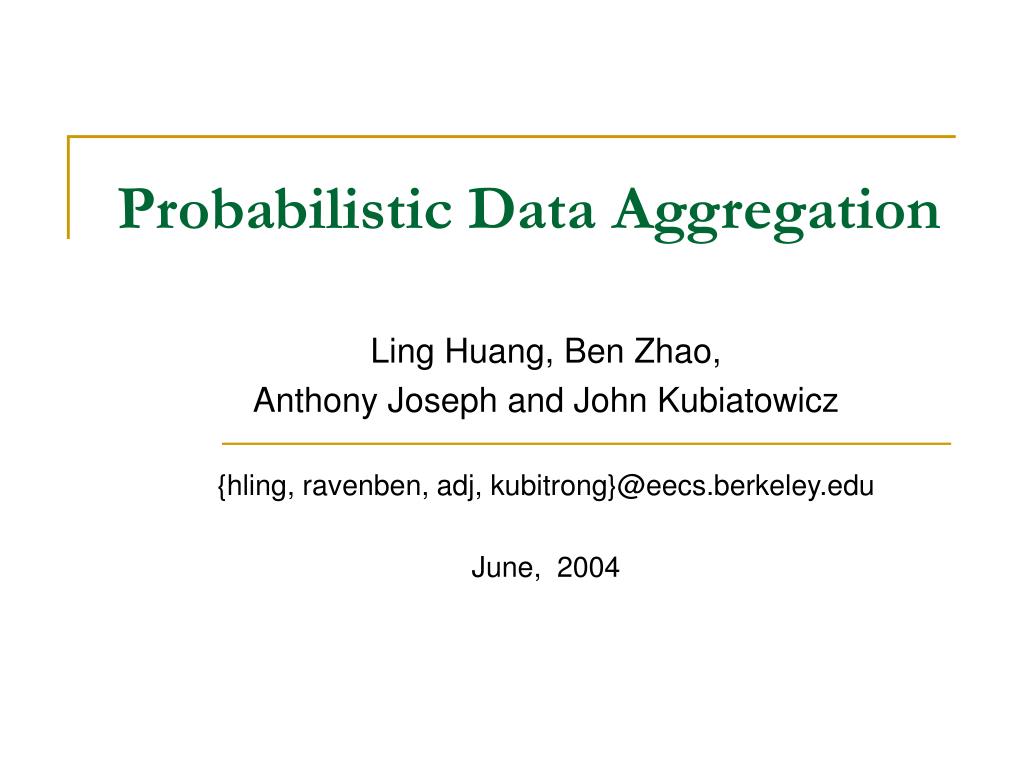 Probabilistic Data Aggregation Ling Huang, Ben Zhao, Anthony Joseph and John Kubiatowicz {hling, ravenben, adj, kubitrong}@eecs.berkeley.edu June, 2004