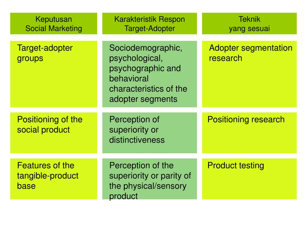 Target-adopter groups Sociodemographic, psychological, psychographic and behavioral characteristics of the adopter segments Keputusan Social Marketing Karakteristik Respon Target-Adopter Teknik yang sesuai Adopter segmentation research Positioning of the social product Perception of superiority or distinctiveness Positioning research Features of the tangible-product base Perception of the superiority or parity of the physical/sensory product Product testing
