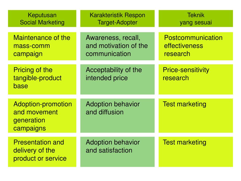 Maintenance of the mass-comm campaign Awareness, recall, and motivation of the communication Keputusan Social Marketing Karakteristik Respon Target-Adopter Teknik yang sesuai Postcommunication effectiveness research Pricing of the tangible-product base Acceptability of the intended price Price-sensitivity research Adoption-promotion and movement generation campaigns Adoption behavior and diffusion Test marketing Presentation and delivery of the product or service Adoption behavior and satisfaction Test marketing
