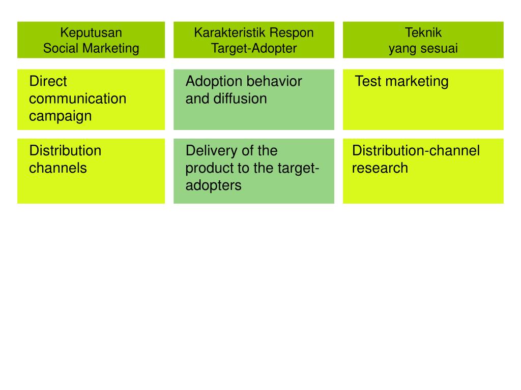 Direct communication campaign Adoption behavior and diffusion Keputusan Social Marketing Karakteristik Respon Target-Adopter Teknik yang sesuai Test marketing Distribution channels Delivery of the product to the target-adopters Distribution-channel research