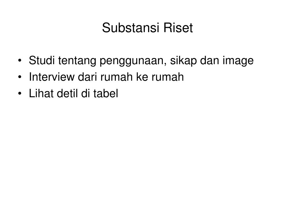 Substansi Riset • Studi tentang penggunaan, sikap dan image • Interview dari rumah ke rumah • Lihat detil di tabel