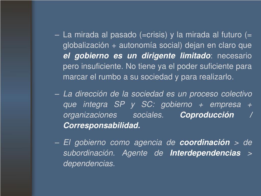 La mirada al pasado (=crisis) y la mirada al futuro (= globalización + autonomía social) dejan en claro que el gobierno es undirigente limitado: necesario pero insuficiente. No tiene ya el poder suficiente para marcar el rumbo a su sociedad y para realizarlo. • La dirección de la sociedad es un proceso colectivo que integra SP y SC: gobierno + empresa + organizaciones sociales. Coproducción / Corresponsabilidad. • El gobierno como agencia de coordinación > de subordinación. Agente de Interdependencias > dependencias.