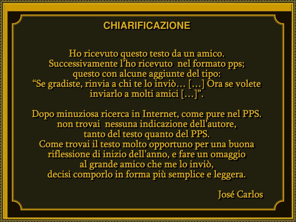 CHIARIFICAZIONE Ho ricevuto questo testo da un amico. Successivamente l’ho ricevuto nel formato pps; questo con alcune aggiunte del tipo: “Se gradiste, rinvia a chi te lo inviò… […] Ora se volete inviarlo a molti amici […]”. Dopo minuziosa ricerca in Internet, come pure nel PPS. non trovai nessuna indicazione dell’autore, tanto del testo quanto del PPS. Come trovai il testo molto opportuno per una buona riflessione di inizio dell’anno, e fare un omaggio al grande amico che me lo inviò, decisi comporlo in forma più semplice e leggera. José Carlos