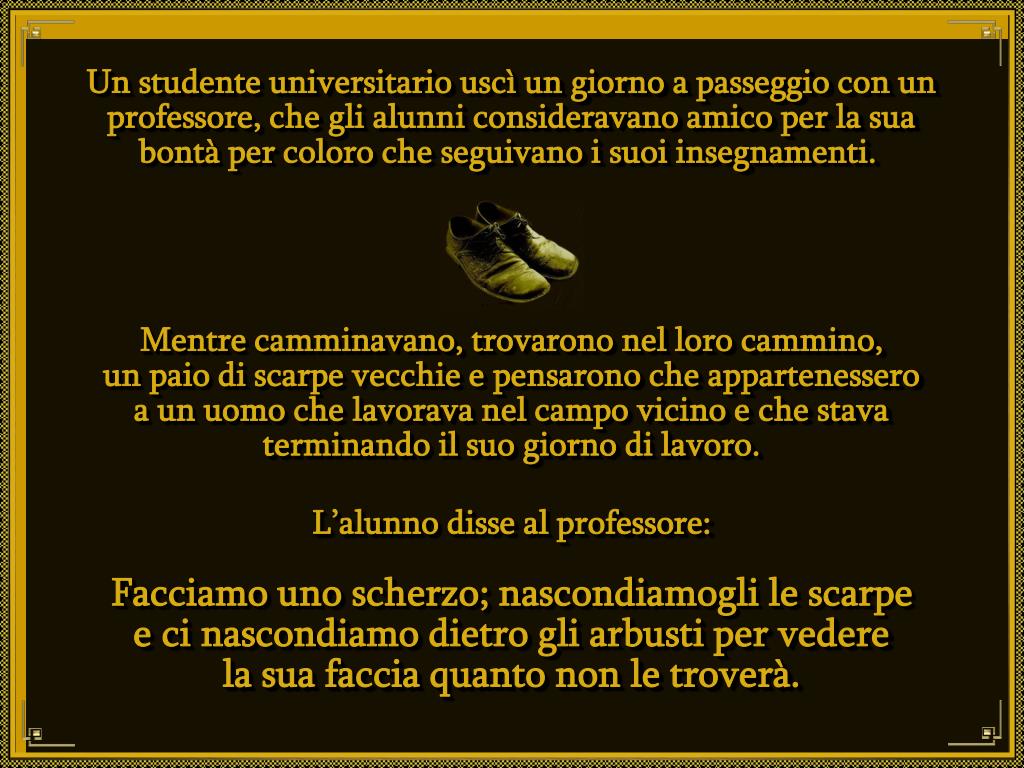Un studente universitario uscì un giorno a passeggio con un professore, che gli alunni consideravano amico per la sua bontà per coloro che seguivano i suoi insegnamenti. Mentre camminavano, trovarono nel loro cammino, un paio di scarpe vecchie e pensarono che appartenessero a un uomo che lavorava nel campo vicino e che stava terminando il suo giorno di lavoro. L’alunno disse al professore: Facciamo uno scherzo; nascondiamogli le scarpe e ci nascondiamo dietro gli arbusti per vedere la sua faccia quanto non le troverà.