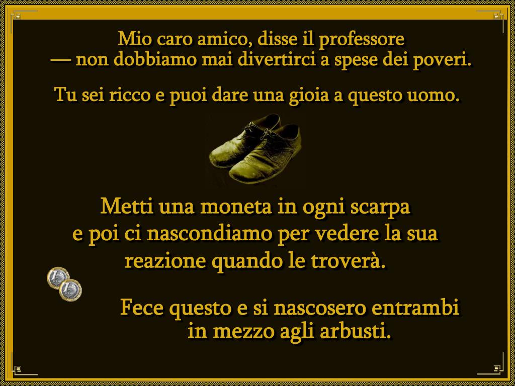 Mio caro amico, disse il professore — non dobbiamo mai divertirci a spese dei poveri. Tu sei ricco e puoi dare una gioia a questo uomo. Metti una moneta in ogni scarpa e poi ci nascondiamo per vedere la sua reazione quando le troverà. Fece questo e si nascosero entrambi in mezzo agli arbusti.