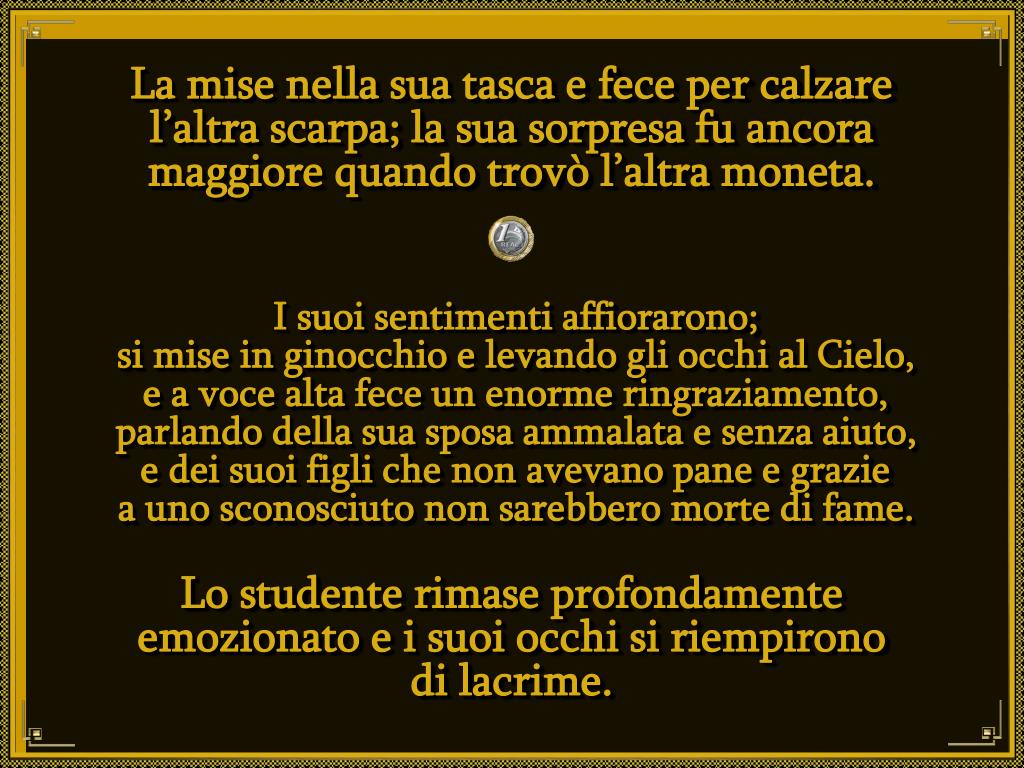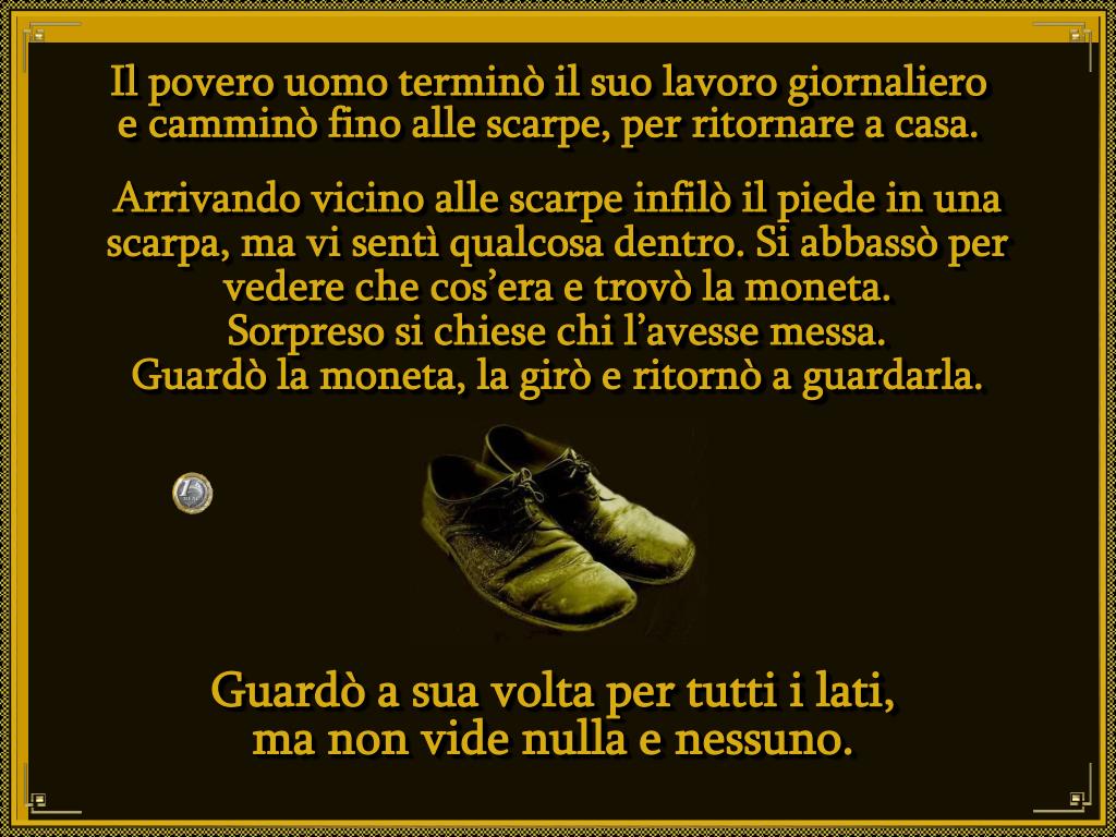 Il povero uomo terminò il suo lavoro giornaliero e camminò fino alle scarpe, per ritornare a casa. Arrivando vicino alle scarpe infilò il piede in una scarpa, ma vi sentì qualcosa dentro. Si abbassò per vedere che cos’era e trovò la moneta. Sorpreso si chiese chi l’avesse messa. Guardò la moneta, la girò e ritornò a guardarla. Guardò a sua volta per tutti i lati, ma non vide nulla e nessuno.