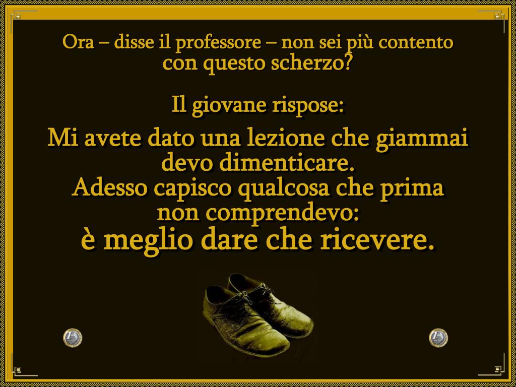 Ora – disse il professore – non sei più contento con questo scherzo? Il giovane rispose: Mi avete dato una lezione che giammai devo dimenticare. Adesso capisco qualcosa che prima non comprendevo: è meglio dare che ricevere.