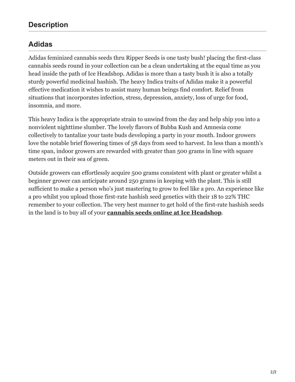 Description Adidas Adidas feminized cannabis seeds thru Ripper Seeds is one tasty bush! placing the first-class cannabis seeds round in your collection can be a clean undertaking at the equal time as you head inside the path of Ice Headshop. Adidas is more than a tasty bush it is also a totally sturdy powerful medicinal hashish. The heavy Indica traits of Adidas make it a powerful effective medication it wishes to assist many human beings find comfort. Relief from situations that incorporates infection, stress, depression, anxiety, loss of urge for food, insomnia, and more. This heavy Indica is the appropriate strain to unwind from the day and help ship you into a nonviolent nighttime slumber. The lovely flavors of Bubba Kush and Amnesia come collectively to tantalize your taste buds developing a party in your mouth. Indoor growers love the notable brief flowering times of 58 days from seed to harvest. In less than a month’s time span, indoor growers are rewarded with greater than 500 grams in line with square meters out in their sea of green. Outside growers can effortlessly acquire 500 grams consistent with plant or greater whilst a beginner grower can anticipate around 250 grams in keeping with the plant. This is still sufficient to make a person who’s just mastering to grow to feel like a pro. An experience like a pro whilst you upload those first-rate hashish seed genetics with their 18 to 22% THC remember to your collection. The very best manner to get hold of the first-rate hashish seeds in the land is to buy all of your cannabis seeds online at Ice Headshop. 2/2