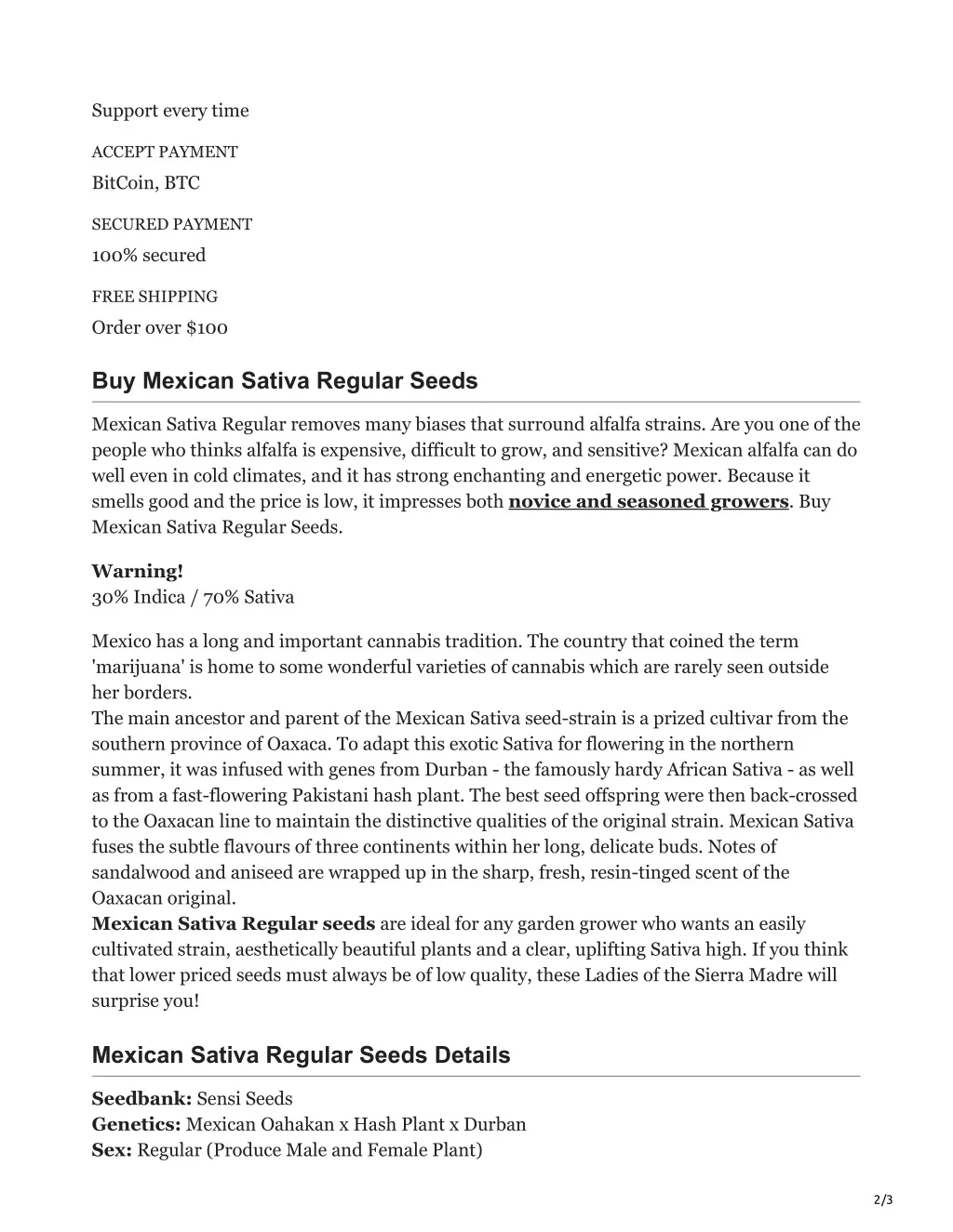 Support every time ACCEPT PAYMENT BitCoin, BTC SECURED PAYMENT 100% secured FREE SHIPPING Order over $100 Buy Mexican Sativa Regular Seeds Mexican Sativa Regular removes many biases that surround alfalfa strains. Are you one of the people who thinks alfalfa is expensive, difficult to grow, and sensitive? Mexican alfalfa can do well even in cold climates, and it has strong enchanting and energetic power. Because it smells good and the price is low, it impresses both novice and seasoned growers. Buy Mexican Sativa Regular Seeds. Warning! 30% Indica / 70% Sativa Mexico has a long and important cannabis tradition. The country that coined the term 'marijuana' is home to some wonderful varieties of cannabis which are rarely seen outside her borders. The main ancestor and parent of the Mexican Sativa seed-strain is a prized cultivar from the southern province of Oaxaca. To adapt this exotic Sativa for flowering in the northern summer, it was infused with genes from Durban - the famously hardy African Sativa - as well as from a fast-flowering Pakistani hash plant. The best seed offspring were then back-crossed to the Oaxacan line to maintain the distinctive qualities of the original strain. Mexican Sativa fuses the subtle flavours of three continents within her long, delicate buds. Notes of sandalwood and aniseed are wrapped up in the sharp, fresh, resin-tinged scent of the Oaxacan original. Mexican Sativa Regular seeds are ideal for any garden grower who wants an easily cultivated strain, aesthetically beautiful plants and a clear, uplifting Sativa high. If you think that lower priced seeds must always be of low quality, these Ladies of the Sierra Madre will surprise you! Mexican Sativa Regular Seeds Details Seedbank: Sensi Seeds Genetics: Mexican Oahakan x Hash Plant x Durban Sex: Regular (Produce Male and Female Plant) 2/3