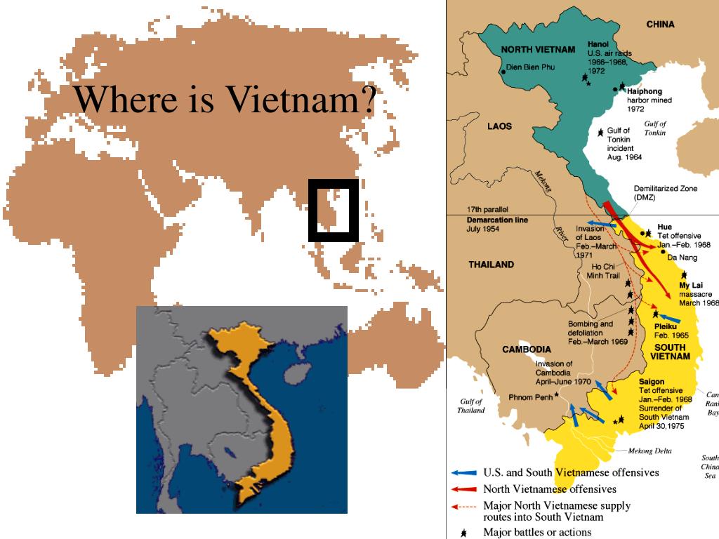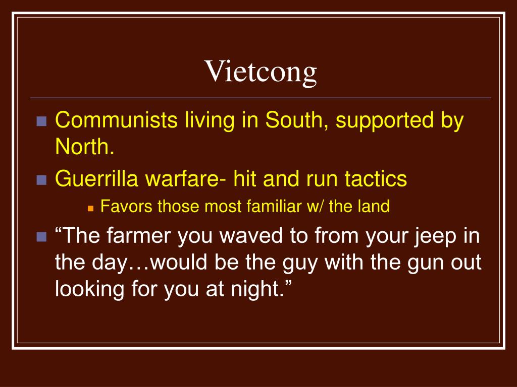 Vietcong • Communists living in South, supported by North. • Guerrilla warfare- hit and run tactics • Favors those most familiar w/ the land • “The farmer you waved to from your jeep in the day…would be the guy with the gun out looking for you at night.”