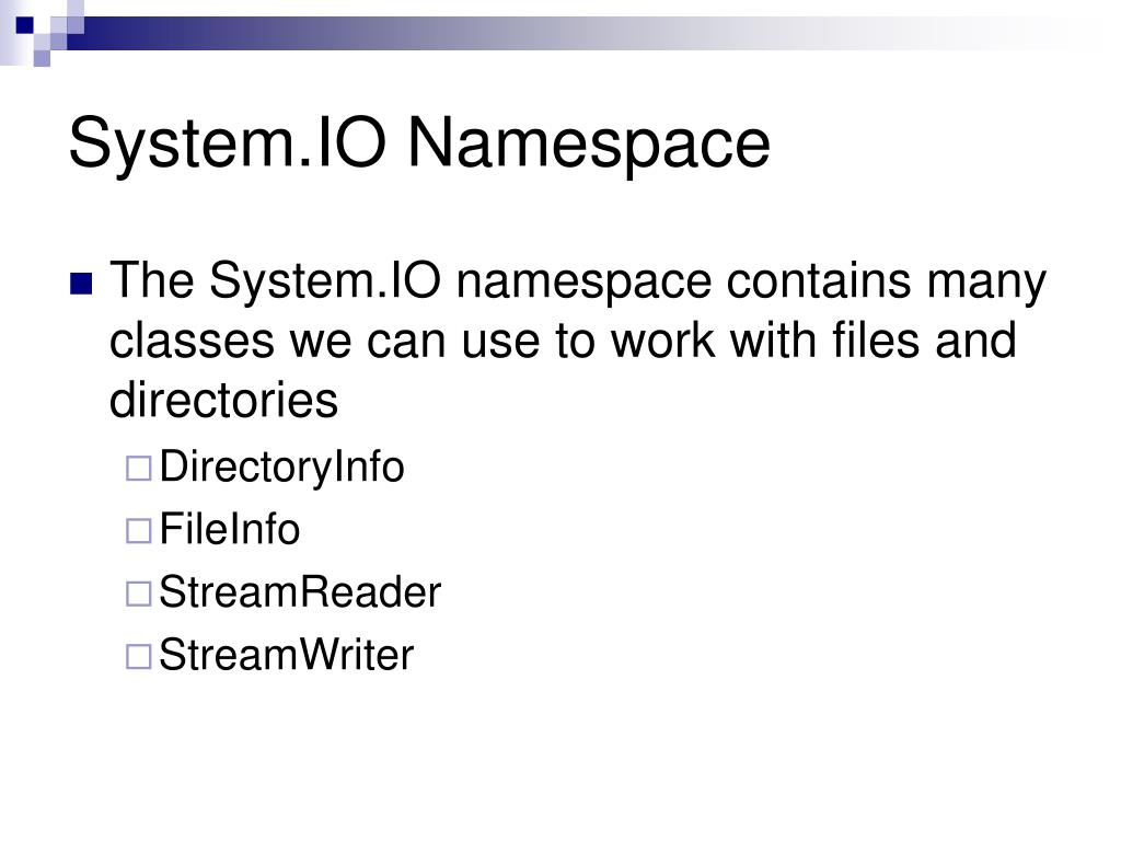 System.IO Namespace • The System.IO namespace contains many classes we can use to work with files and directories • DirectoryInfo • FileInfo • StreamReader • StreamWriter