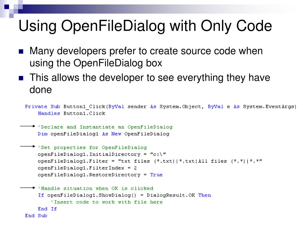 Using OpenFileDialog with Only Code • Many developers prefer to create source code when using the OpenFileDialog box • This allows the developer to see everything they have done