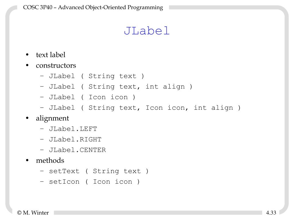 JLabel • text label • constructors • JLabel ( String text ) • JLabel ( String text, int align ) • JLabel ( Icon icon ) • JLabel ( String text, Icon icon, int align ) • alignment • JLabel.LEFT • JLabel.RIGHT • JLabel.CENTER • methods • setText ( String text ) • setIcon ( Icon icon )