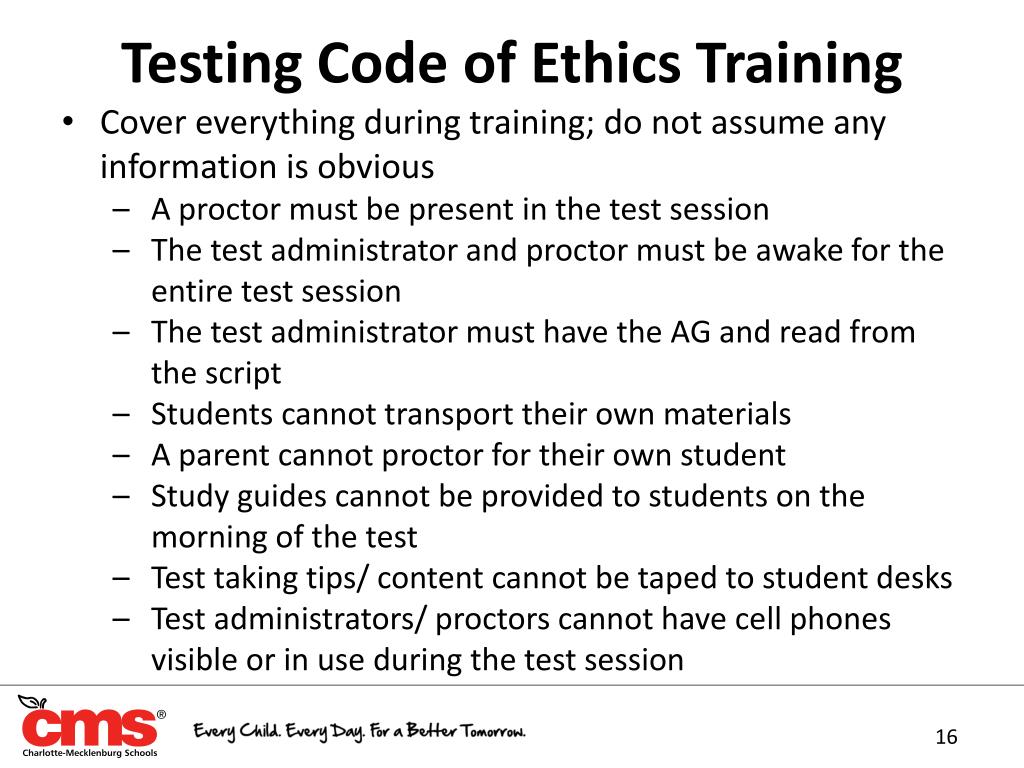 Testing Code of Ethics Training • Cover everything during training; do not assume any information is obvious • A proctor must be present in the test session • The test administrator and proctor must be awake for the entire test session • The test administrator must have the AG and read from the script • Students cannot transport their own materials • A parent cannot proctor for their own student • Study guides cannot be provided to students on the morning of the test • Test taking tips/ content cannot be taped to student desks • Test administrators/ proctors cannot have cell phones visible or in use during the test session