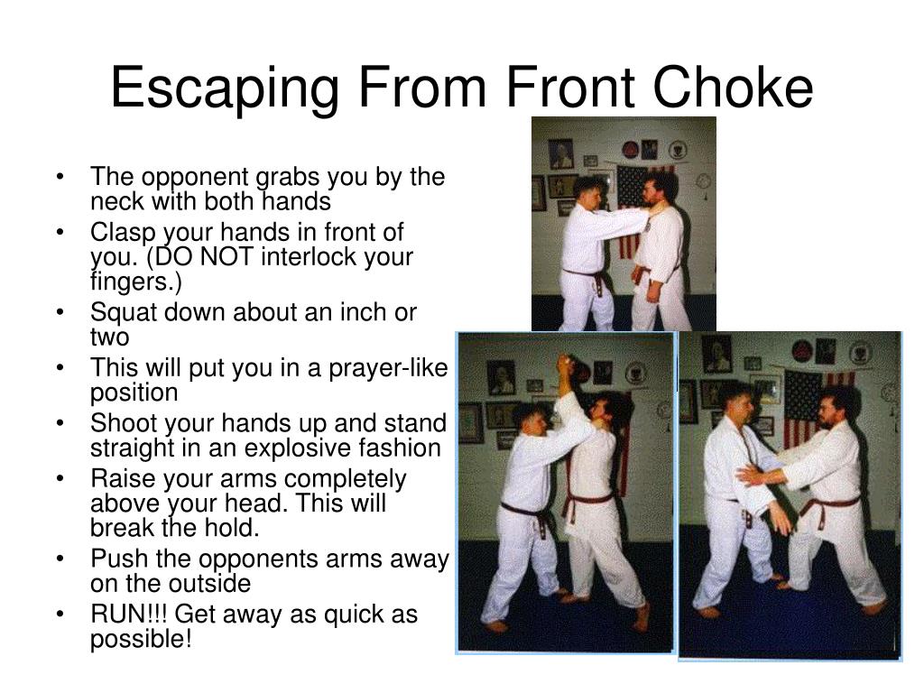 Escaping From Front Choke • The opponent grabs you by the neck with both hands • Clasp your hands in front of you. (DO NOT interlock your fingers.) • Squat down about an inch or two • This will put you in a prayer-like position • Shoot your hands up and stand straight in an explosive fashion • Raise your arms completely above your head. This will break the hold. • Push the opponents arms away on the outside • RUN!!! Get away as quick as possible!