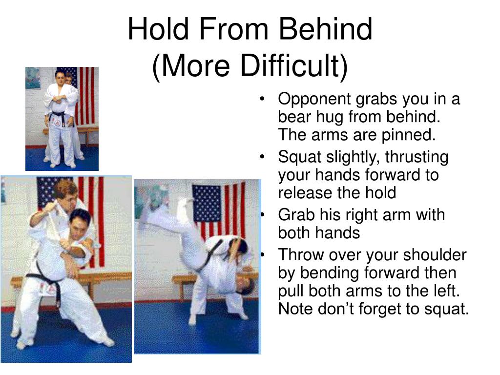 Opponent grabs you in a bear hug from behind. The arms are pinned. Squat slightly, thrusting your hands forward to release the hold Grab his right arm with both hands Throw over your shoulder by bending forward then pull both arms to the left. Note don’t forget to squat. Hold From Behind (More Difficult)