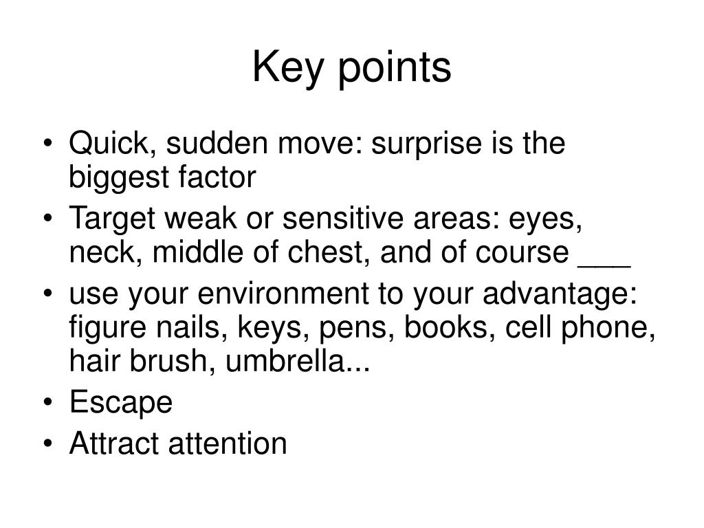 Key points • Quick, sudden move: surprise is the biggest factor • Target weak or sensitive areas: eyes, neck, middle of chest, and of course ___ • use your environment to your advantage: figure nails, keys, pens, books, cell phone, hair brush, umbrella... • Escape • Attract attention