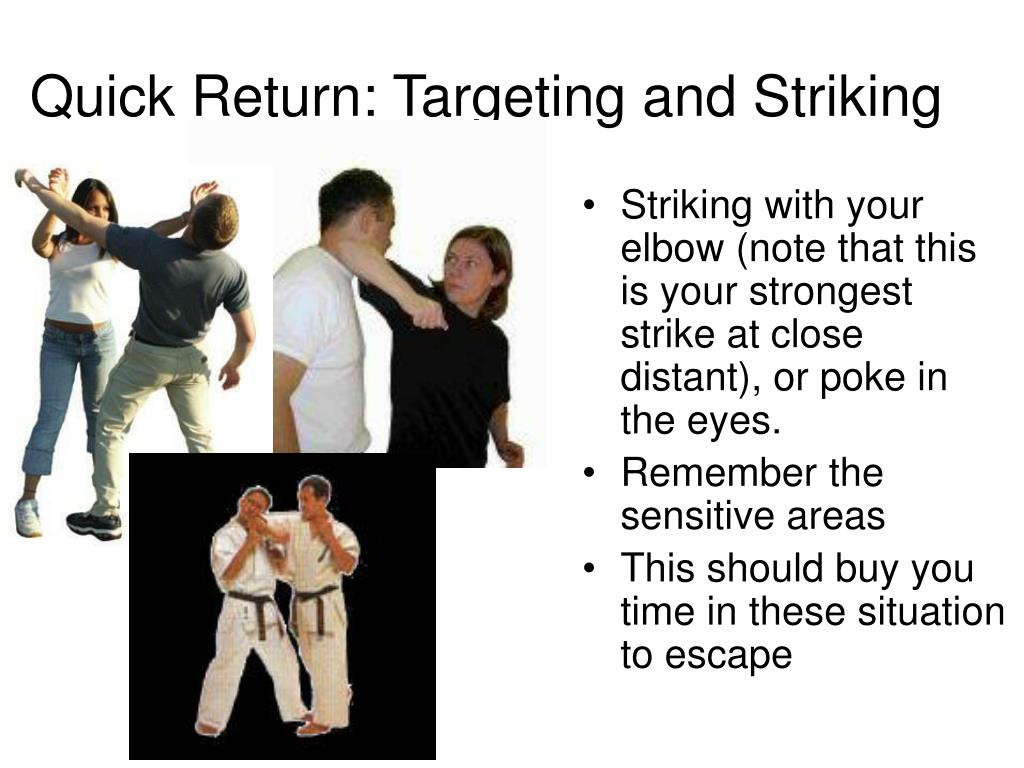 Quick Return: Targeting and Striking • Striking with your elbow (note that this is your strongest strike at close distant), or poke in the eyes. • Remember the sensitive areas • This should buy you time in these situation to escape
