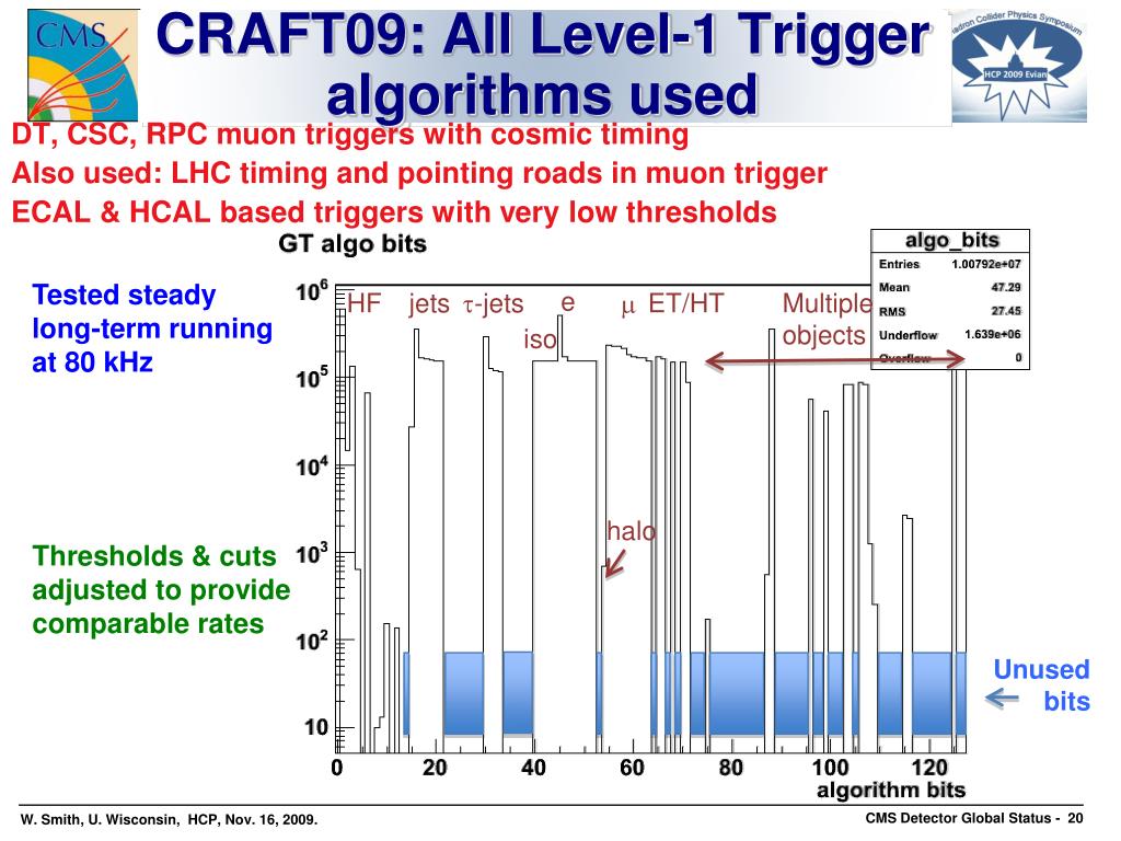 CRAFT09: All Level-1 Trigger algorithms used • DT, CSC, RPC muon triggers with cosmic timing • Also used: LHC timing and pointing roads in muon trigger • ECAL & HCAL based triggers with very low thresholds e HF jets -jets ET/HT Multiple objects iso Tested steady long-term running at 80 kHz halo Thresholds & cuts adjusted to provide comparable rates Unused bits