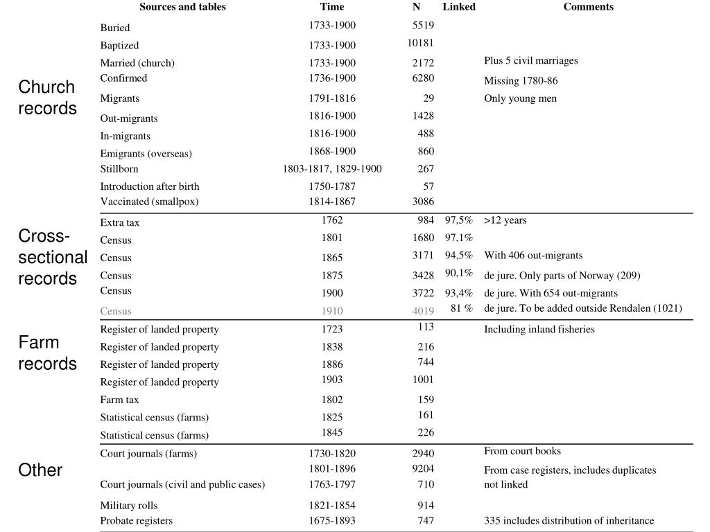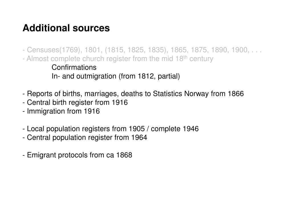 Additionalsources • - Censuses(1769), 1801, (1815, 1825, 1835), 1865, 1875, 1890, 1900, . . . • Almost complete church register from the mid 18th century • Confirmations • In- and outmigration (from 1812, partial) • - Reports of births, marriages, deaths to Statistics Norway from 1866 • - Central birth register from 1916 • - Immigration from 1916 • - Local population registers from 1905 / complete 1946 • Central population register from 1964 • - Emigrant protocols from ca 1868
