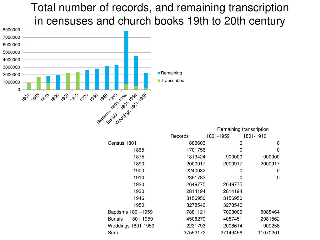 Total numberofrecords, and remainingtranscriptionin censuses and churchbooks 19th to 20th century