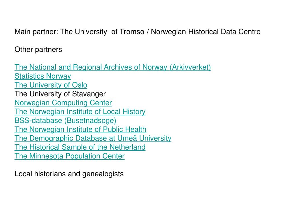 Main partner: The University of Tromsø/ Norwegian Historical Data Centre Other partners The National and Regional Archives of Norway (Arkivverket)Statistics NorwayThe University of Oslo The University of StavangerNorwegian Computing CenterThe Norwegian Institute of Local HistoryBSS-database (Busetnadsoge)The Norwegian Institute of Public HealthThe Demographic Database at Umeå UniversityThe Historical Sample of the NetherlandThe Minnesota Population Center Local historians and genealogists