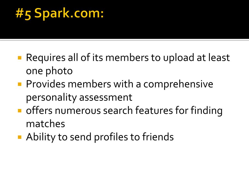 #5 Spark.com: • Requires all of its members to upload at least one photo • Provides members with a comprehensive personality assessment • offers numerous search features for finding matches • Ability to send profiles to friends