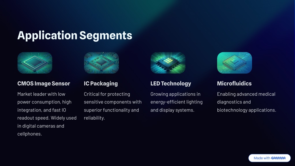 6. Application Segments CMOS Image Sensor IC Packaging LED Technology Microfluidics Market leader with low power consumption, high integration, and fast IO readout speed. Widely used in digital cameras and cellphones. Critical for protecting sensitive components with superior functionality and reliability. Growing applications in energy-efficient lighting and display systems. Enabling advanced medical diagnostics and biotechnology applications.